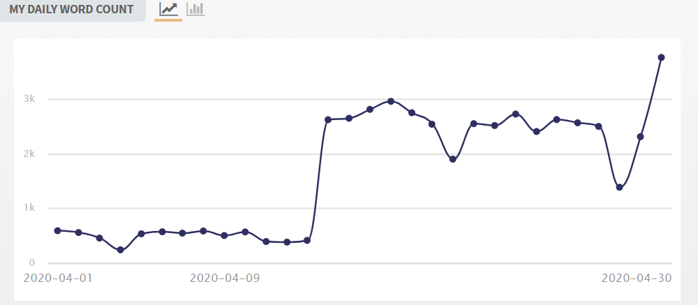 On April 14, I changed my goal from 15,000 words to 50,000 words. That meant I had to be writing 2,500 words daily instead of 500. While I wasn’t sure that I would make the 50,000 words by the end of April, I knew that it was entirely possible. Before writing fell slightly to the wayside, writing 2,500 words a day wasn’t that hard for me. It meant I had to write for an hour and a half to two hours.